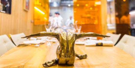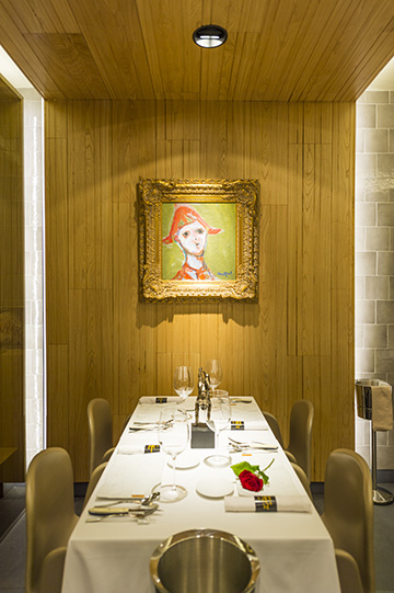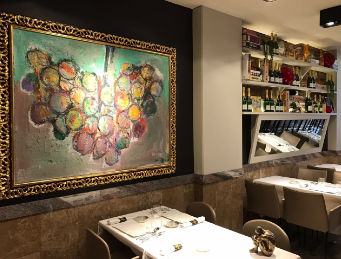 En La Taverna, el arte está en el plato…y en la sala. 11 pinturas de Muxart y una docena de esculturas de XXX acompañan al comensal en su experiencia gastronómica.